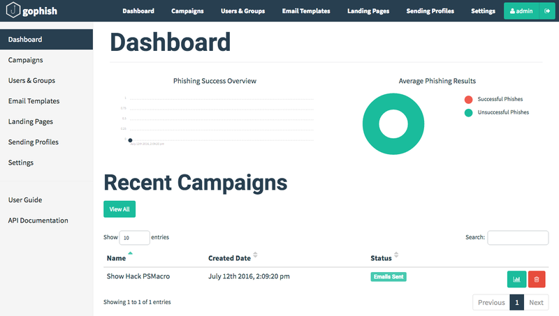 $ docker run -ti --name gophish -p 3333:3333 -p 8083:80 matteoggl/gophishAlso, to create the backdoored Office document a version of Microsoft Office is necessary.