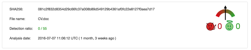 Depending on the scenario the user will be more or less suspecting. Some might scan the document with an antivirus software to be safe. Unfortunately, the results are quite terrifying.