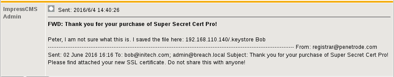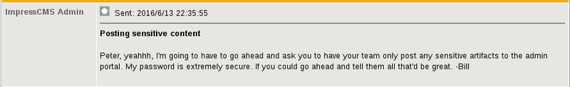 So we need a password to access the keystore. Thankfully, Bill sent Peter a memo that all security relevant information shall be posted in a particular section of the admin portal. Maybe the search yields some results.