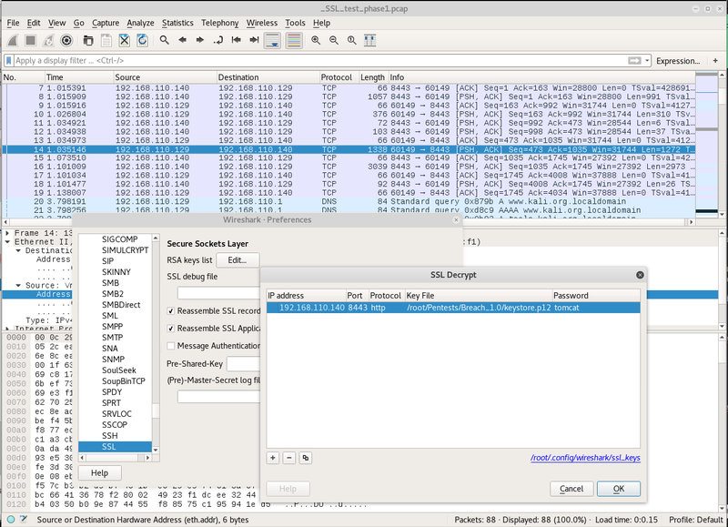 Now, open the packet capture in wireshark and set the options to decrypt the traffic. Set the respective options via “Edit”->“Preferences”->“Protocols”->“SSL”.