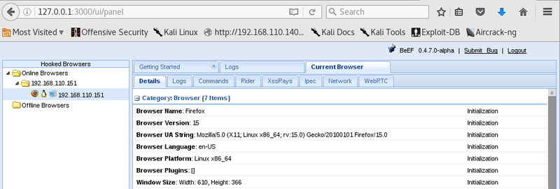 So when Peter is browsing his blog and visits the members page the BeEF hook will execute and establish a connection to the control panel. After a minute or two a browser connects.
