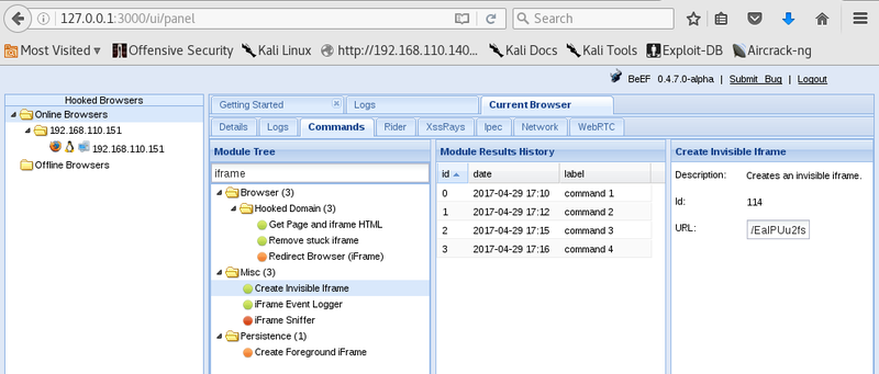 After starting the exploit server the client has to be redirected in order to exploit the browser. This can be achieved in multiple ways in BeEF.