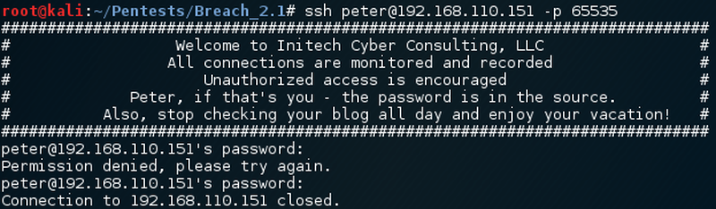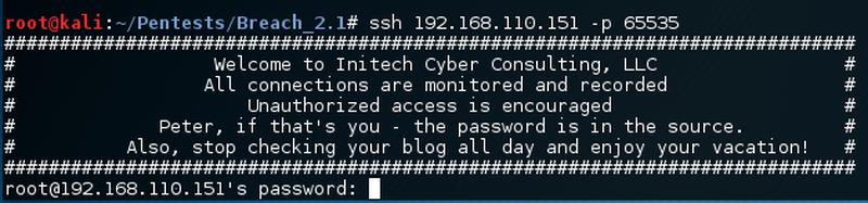 Let’s try and connect to it with ssh 192.168.110.151 -p 65535.