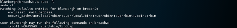 So the user blumbergh can execute tcpdump. Trying to get tcpdump running in order to capture some packets did not work. RTFM, there might be some feature that I missed up until now. The manpages do in fact list one option that could help in this precarious situation.