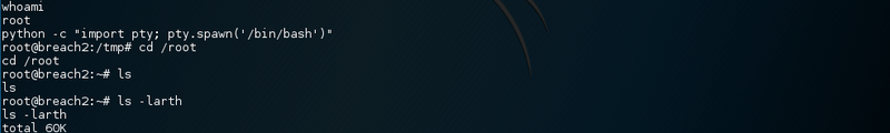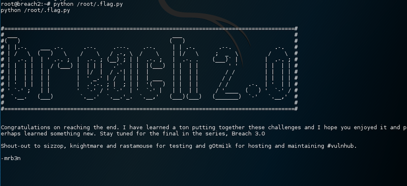 With root rights on the box let’s first start a fancy tty shell. The root user’s home directory has got a “hidden” flag.py file inside. Executing the python script outputs the credits for Breach 2.1. Win!