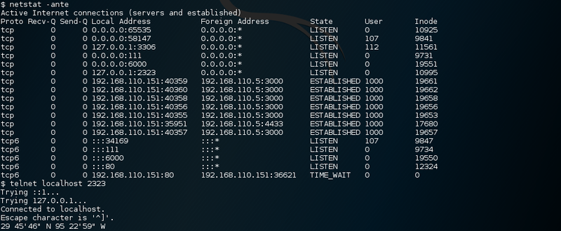 Finally on the system. What next? Running post exploitation scripts to gather additional information might provide a next hint. Netstat list the localhost:2323 as open. Let’s find out what is waiting there for us.