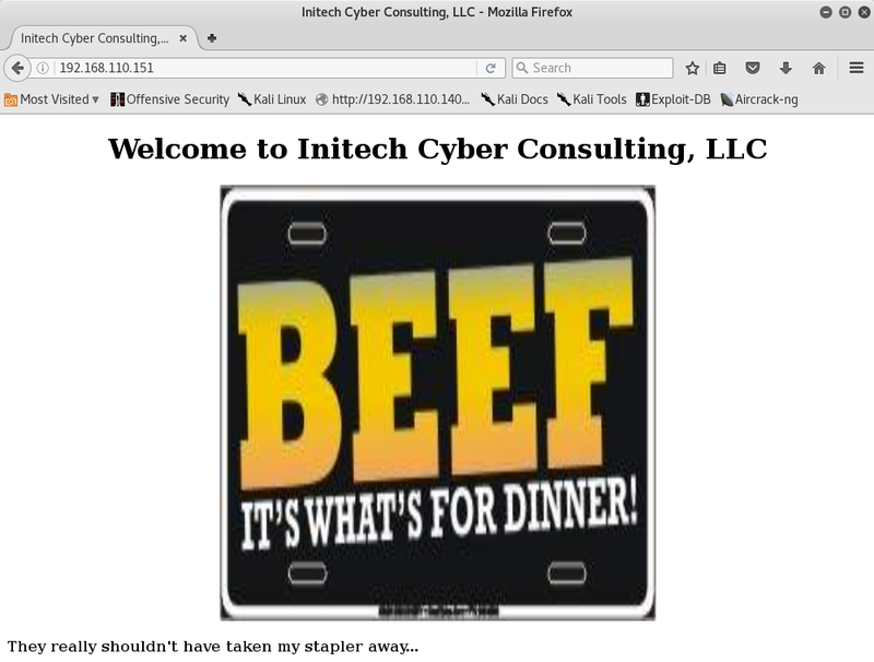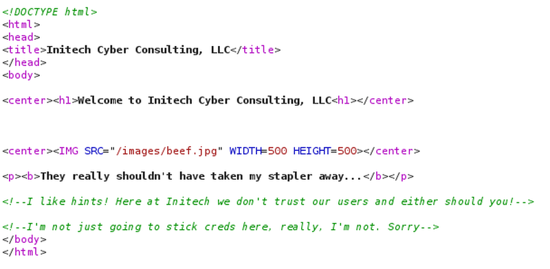 +|_ http-title: Initech Cyber Consulting, LLCThat is interesting, maybe the SSH login triggered the port to open? Let’s see for ourselves.