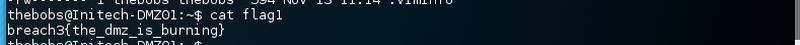 Simply cat the first flag breach3{the_dmz_is_burning}.