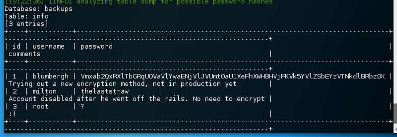 backups database dumpSo, milton’s account is disabled according to the comment. Root does only have a question mark as a password. Seems like blumbergh has his password base64 encrypted. In fact the password is secured by a nested encryption algorithm which super difficult to crack. However, the following command can be utilized to decrypt it to cleartext.